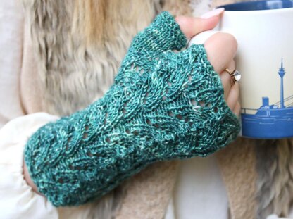 These fingerless mittens are a fantastic combination of lovely yarn and pretty lace pattern, reminding of dragon scales. They are easy to knit and yield striking results, especially when you are using solid colours or tonal yarns. The mitts form a set with the Chase the Dragon Socks