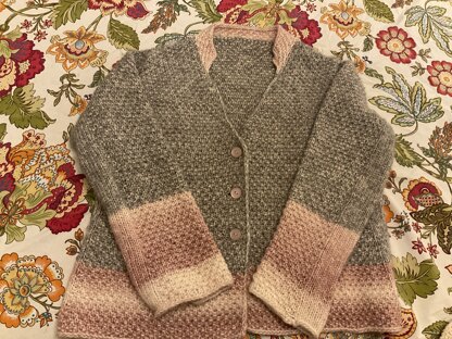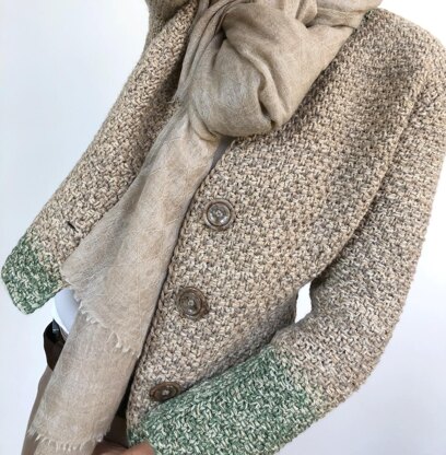 Timeless chic in a tweed-like jacket-cardigan with contrasting accents. With or without buttons. A well-fitting shoulder construction and slight tailoring with options make this a perfectly fitting cardigan for you. The tweed-effect is achieved by using several threads of thin yarn combined to an aran weight strand – create your own unique tweed!