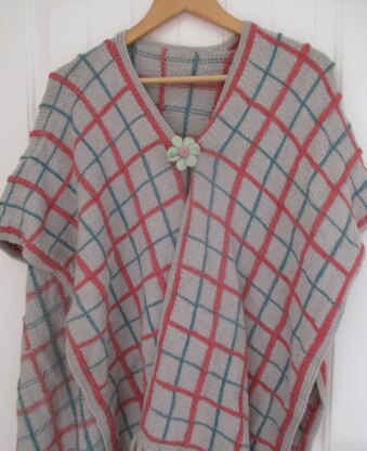 This is a pattern for a blanket poncho, originally published in Knitting magazine. It has a checked pattern in intarsia, and fringing on the bottom edges. The flower pin holding it together is shown as a way of fastening it.
