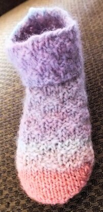 Done on the 36 peg 1/4" gauge Cindwood loom It has a double wedge heel that has a link for the video tutorial. (new) Also uses a variation of the drawstring toe. Had pictures and written instructions. It a very simple sock pattern if you are starting out. I would suggest a DK weight yarn, but I used Lions Brand Amazing and barely used half the skein to make this pair. Please let me know if you are interested on me explaining how to make this sock and a larger size, otherwise it is written for a toddler sizing.