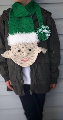 - Pattern calls for a fluffy or eyelash yarn for the trimming on the elf hat portion of the scarf.