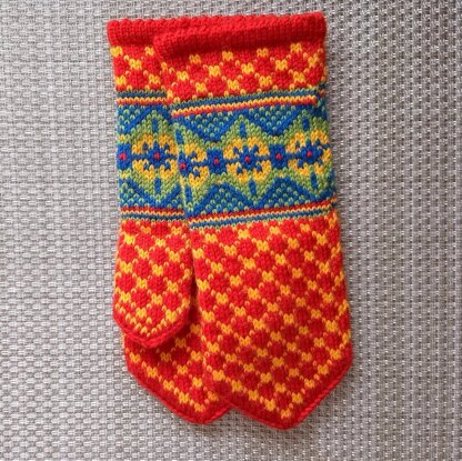 About 70 g of main color; 50 g of secondary; 20 g of other two colors; yarn size 3 or light. Size 0 or 2 mm needles (DP or circular, your choice) Yarn needle to weave in the ends Red: Cascade 220 Superwash Merino Col. 96 “Molten Lava” Size 3/Light Yellow: Cascade 220 Superwash Col. 263 “Gold Fusion” Size 3/Light Blue: Cascade 220 Superwash Col. 252 “Celestial” Size 3/Light Green: Cascade 220 Superwash Col.286 “Peridot” Size 3/Light