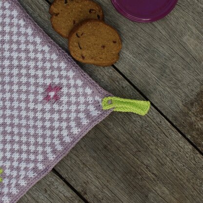 These Potholders are knitted in the round. The double sides make them very soft and comfortable to use. You will knit the front side by following a colour diagram. The backside is knitted as two coloured squares only.