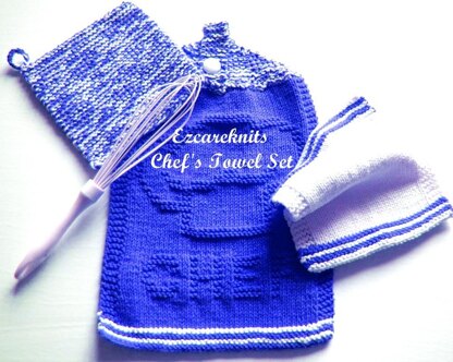 A hand towel, washcloth and pot holder knitting pattern set with the word chef and his chef’s cap. This set will make for a great gift to add to any home décor. The set is written in English and have step by step instructions. The hand towel measures approx. 10” W by 12” H from bottom of yoke to bottom of towel. The washcloth measures approx. 8” W X 8” H and the potholder 7” W X 7” H Either a 7/8 in(22mm) or a ¾(19mm) button will work best. The yoke and potholder are knitted with 2 strands of yarn, so the towel hangs more securely, and the potholder has the thickness for setting hot items. Patterns are for personal use only. Patterns, designs, and pictures are copyright and the property of Ezcareknits. Designs are strictly prohibited from use in another pattern for sale. By purchasing this pattern, you agreed to abide by these terms. If you have any questions, please feel free to contact me.
