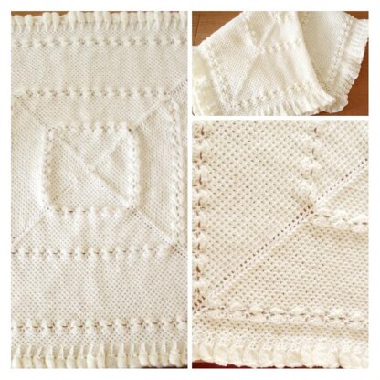 Lovely baby blanket incorporating 3 different stitches. Knitted in 4 pieces and stitched together using the loops you create making super flat and neat seams.