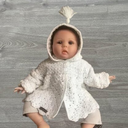Create a lace-style baby hoodie with a delicate textured design and hooded cardigan style. The jacket is worked seamlessly from the armholes up and then down with no side seams. The sweater has a neat, professional finish for everyday wear and special occasions, sized for baby girls.