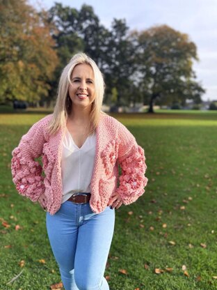 Pink cherry blossom chunky cardigan is easy to knit but also interesting, as you get a chance to use bobble stitch and rick rack rib stich techniques, as well as crocheting flowers.