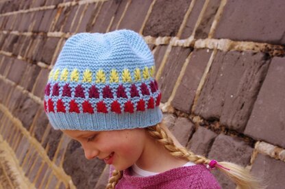 Cherrypool is a deceptively simple beanie with a lot of wow factor. A garter stitch body hosts a series of stitch clusters reminiscent of flames and fire. Only one colour is ever worked in a round, with all the colourwork deceptively created by slipped stitches. Jogless garter stitch worked over the body of the hat maintains the integrity of the stitch pattern.