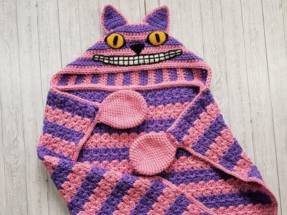 What a great idea! This spooky Cheshire cat hooded blanket is also a decoration for your room. Use it to keep warm and snugly, and when you are done with it, fold it and display it on your sofa, armchair or bed. Leave out the face, keep the ears and turn this design into a cat hooded blanket by crocheting it in black, white, gray or brown. The possibilities are endless. Check out my other hooded blankets in my Etsy shop.