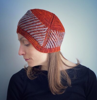 This very geometric hat combines the squish and warmth of brioche stitch with the increases and decrease that create a chevron stitch pattern. The biasing of the fabric results in built-in ear flaps for a cozy fit. If you've mastered basic two-color brioche stitch and want to expand your skills, this hat pattern will introduce you to basic brioche increases and decreases.