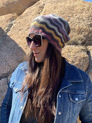 The pattern includes the regular and slouchy instructions in four sizes to fit heads from 15” to 22” circumference.