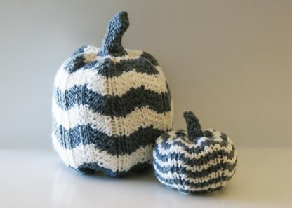These pumpkins are knit in the round from the bottom up. With instructions and photos for how to knit and finish both sizes (small approx. 5" diameter x 4.5" high and large approx. 7" diameter x 11.5" high ), this pattern is an easy to follow how-to.