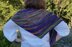 The shawl is knit side-to-side in garter stitch, using increases and decreases to produce the asymmetrical vortex shape that makes the stripes appear on the bias. There are both charts and written instructions for the lace sections.