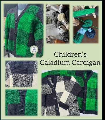 The Caladium Cardigan is a top-down, modified drop-shoulder cardigan for toddlers and children. The plaid pattern is created by knitting blocks of colour in alternating plain and marled coloured yarn. Shoulders are shaped with short rows for a better fit. The cardigan is finished with a sturdy double-knit button band. It provides a cozy, loose fit that won’t get in the way of playing!