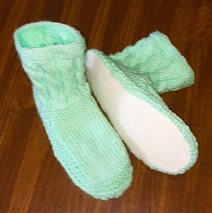 These slippers are started in a round on 4 double point needles, the instep is added and then a circular needle is used to knit in a round to complete the foot. A separate sole is crocheted or sewn on to the bottom of the slipper. These soles will have to be purchased separately/
