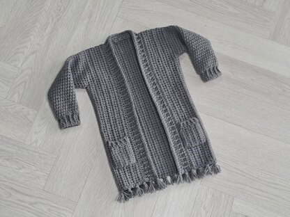 This long line cardigan/coatigan crochet pattern includes girls sizes age 2-3, 3-4, 4-6, 6-8 & 8-10 years. It requires between 250g and 500g of DK yarn.