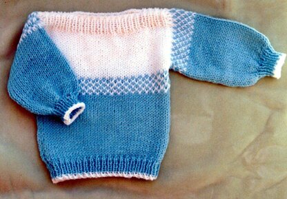 SUPER easy! Easy shaping too. This is a good beginner project, especially if you never knit with 2 colors before. This very easy style and color pattern can be done by beginners! Sizes from 1-3 yrs, to 9 to 10 yrs. A good range of sizes, to help you use up your yarns! This sweater is the fastest sweater pattern we have seen with color! Uses worsted weight yarns, knitting needles, US # 11.