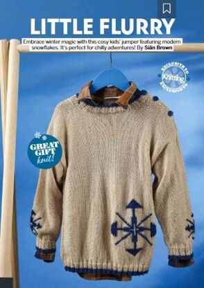 This is a snowflake jumper, originally published in Simply Knitting. It is worked in stocking stitch with an intarsia snowflake motif, 2 x 2 rib edges. The motif can also be worked in Swiss darning. Photos Simply Knitting.