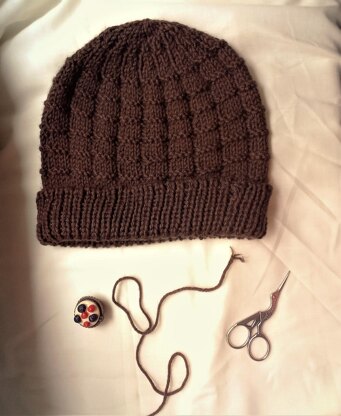 El chocolate se presenta en forma de gorro tipo “beanie” tejido en circular, empezando por el elástico, que será doble; y continuando con el patrón de tableta de chocolate.