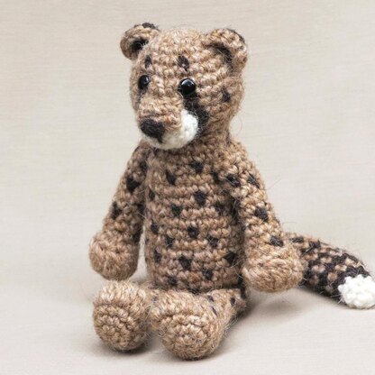 Materials For this cheetah you'll need worsted weight yarn and an E US/3.5 mm crochet hook. You'll need three colours of yarn: oatmeal (1/3 of a 100 yard skein), black brown(1/6) and a leftover bit of white. The quantities are estimates. For the eyes I've used 8 mm animal eyes. You will also need fibrefill and pellets for extra weight in the body (I use Hama beads). Lopi colour numbers: 1419, 0052 and 0051.