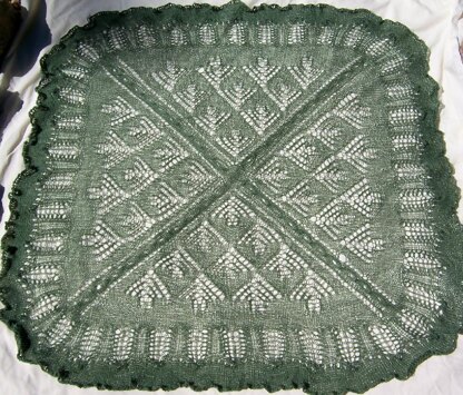 This is a fun, lace-knit with eyelet-cables separating the sides. Starting in the center with just 8 sts, you'll increase as you knit the trees, heading to the lace edge and stockinette, where you'll bind off the 1440 sts loosely. This would make a great shawl (the alpaca/silk blend is such a luscious, next to your skin "hand)) or an heirloom baby blanket.
