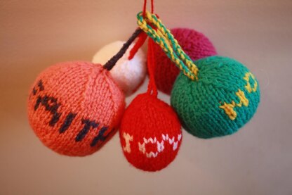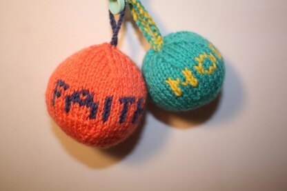 The Christmas season is upon us. Decorations and ornaments are plentiful in all the stores already. But what if you want to make some personal baubles this year? Knit in the round patterns pose a problem for lots of knitters. To this end I have written a pattern for a set of Christmas Baubles knit flat and in three sizes. The intarsia that I charted in the center section of each displays the words Peace, Hope, Love, Joy , Christ (the advent candle). Noel and Faith are also charted for knitting. The pattern is simple and one could easily use the basic pattern and chart other words or pictures if you do not want a religious theme.. Use up your bits and bobs of baby (or aran or even worsted) to make a set for your tree or even as a gift this season. I used baby yarn for this set so if you use a heavier weight yarn the baubles will be a bit larger.