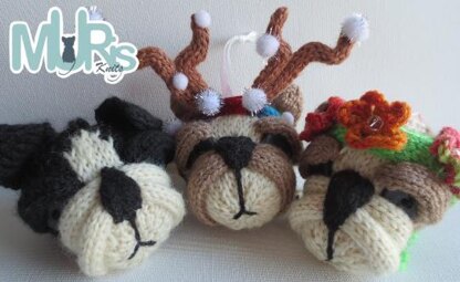 Yarn: 1. #3 light, one or two colours*(Note: other weights of yarn and needle sizes can be used, but this will affect the finished size of the bulldog)* 2. Contrast yarn for antlers, flowers & head band; black for nose.