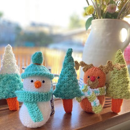The patterns take you step-by-step through knitting and making up a snowman, Rudolph reindeer and a mini forest of Christmas trees. Everything is knitted flat (so there is no working in the round) and it is suitable for knitters with just a little experience. The trees pattern teaches you how to knit texture to make a lovely 'bobbly' effect and they can be knitted with or without ‘snow’ on the top!