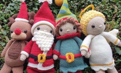 Complete set of 4 crochet amigurumi PATTERNS! Patterns include the list of suggested used yarns (Paintbox and Stylecraft Yarns) Included patterns: - Santa - about 39 cm long and 27 cm seated - Elf - about 39 cm long and 27 cm seated - Rudolph - about 47 cm long and 38 cm seated - Angel - about 39 cm long and 27 cm seated !! Sizes using Aran weight yarn and 5.00 mm crochet hook !! The patterns are written in English (US) using US terminology
