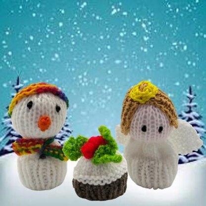 Cosies are worked mostly in DK, gauge is not particularly important. They take only a small amount of each colour yarn. Christmas Angel and Snowman are about 10cm high, Christmas Pudding about 7cm. Each one only takes 2-3 hours to knit and complete.