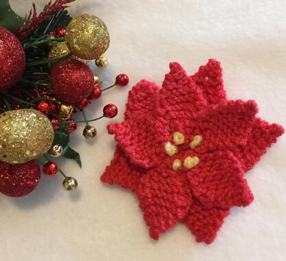 A pretty poinsettia, to use as an ornament, package trim, hat trim, purse trim, or trim towels and lines for the Holidays! This is very fast and easy to knit! Use up scraps of sport weight yarns, knitting needles US # 6. We like the new Pink poinsettia colors, but you can use the traditional red, or white too. It is perfect for Holiday decorating! Finished size varies from 3½ to 4.