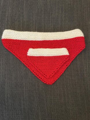 This pet bandana is a great project for the motivated beginner. It consists only of knit, yarn over stitches and needle cast on. Video links are provided to help you through it, if needed.