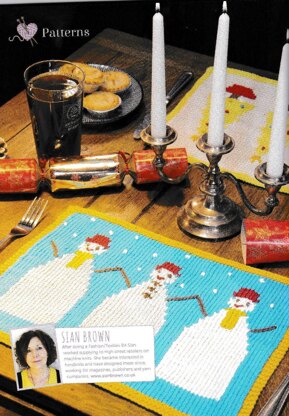 This is a pattern for Christmas Placemats, originally published in the Winter Knitting Bookazine from Future publishers. They are knitted in intarsia with embroidery added afterwards. The first is a fir tree with Christmas decorations embroidered. The second has three snowmen with snowflakes embroidered around them. The edges are in garter stitch. The yarn amounts are for the main colours. You will also need a small amount of the rest of the contrast colours. (mustard, cherry, nougat). Photo Future Publishing.