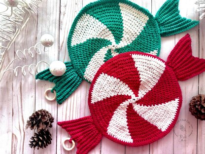 9" rounds with the addition of candy wrapper sides, one of which will have a hidden hook to allow potholders to conveniently and festively hang in your kitchen.