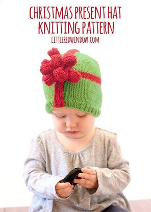 A cute little Christmas Present Hat with fun big bow! (Or change up the colors and it can be a Birthday Present Hat!) This pattern is available right here in an easy to print PDF with additional size options above!
