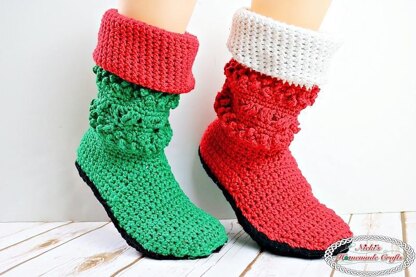 This Crochet Along pattern is a Christmas crochet pattern that can be made into either Santa or Elf Booties depending on the colors used. Crochet Along is over, but pattern is still available. The pattern was designed such that anyone can make themselves booties as it is mentioned when and where to adjust the pattern according to YOUR feet as no feet are the same.