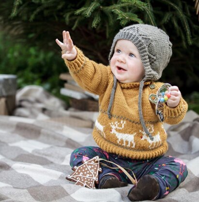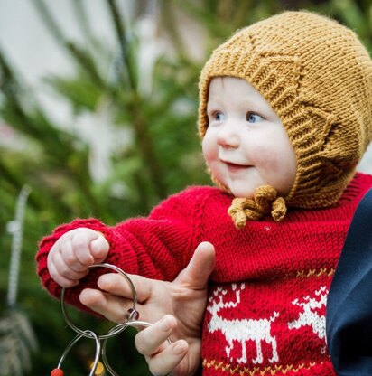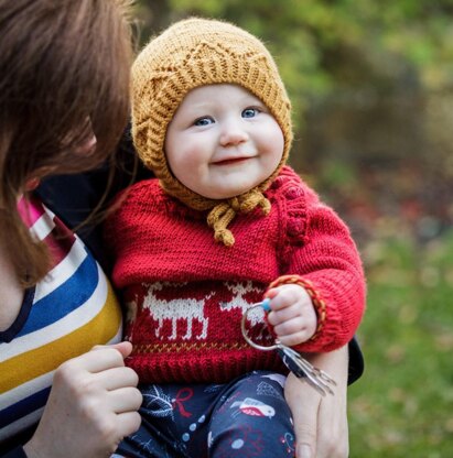 This festive jumper for babies is perfect for a babies first Christmas and comes with a co-ordinating traditional bonnet. I made it in Debbie Bliss Cashmerino but a finer double knitting with a similar tension would work well too. The jumpers are knitted in parts and have abutton fastening so no tight stretching over little ones’ heads. The colourwork is effective but simple enough for a beginner to tackle. The final touch to add even more cuteness is red or contrasting noses that are sewn on at the end.