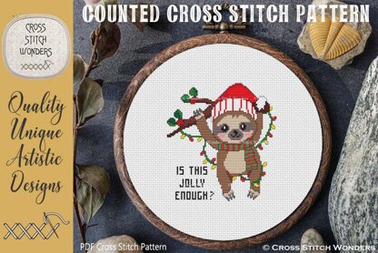 An adorable Sloth being jolly for Christmas! \n\nCross Stitch Pattern designed by Marcia Manning.\n\nDesign is 79 stitches wide by 85 stitches high.\n\nSize 11 count: 7.18 x 7.73 inches or 18.24 x 19.63 cm\nSize 14 count: 5.64 x 6.07 inches or 14.33 x 15.42 cm\nSize 16 count: 4.94 x 5.31 inches or 12.54 x 13.49 cm\nSize 18 count: 4.39 x 4.72 inches or 11.15 x 11.99 cm