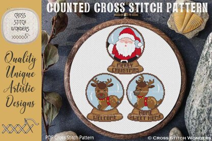 3 Adorable Christmas Snow Globes counted cross stitch designs!\n\nCross Stitch designs by Marcia Manning.\n\nEach Snow Globe is 64 stitches wide by 81 stitches high.\nSize 11 count: 5.82 x 7.36 inches or 14.78 x 18.70 cm\nSize 14 count: 4.57 x 5.79 inches or 11.61 x 14.70 cm\nSize 16 count: 4.00 x 5.06 inches or 10.16 x 12.86 cm\nSize 18 count: 3.56 x 4.50 inches or 9.03 x 11.43 cm\n\nStitch the words in the base to your liking or omit words entirely.