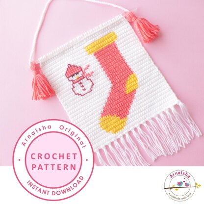 This Christmas Sock crochet wall hanging is very easy to make. It looks beautiful and perfect décor for Christmas season. It is very quick to make so you can make multiples in very short time and gift to your loved ones. They will love it! It is made with only single crochet stitch with cute, adorable Snowman worked in cross stitch! The pattern is written in very simple language with all required details along with chart diagram and step by step description with photos. So very beginner with basic knowledge of single crochet can make this wall hanging. The pattern also includes details with photos of- How to change colors, How to use Intarsia crochet technique, How to do Blocking to get neat finishing
