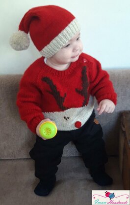 This beautiful Christmas sweater and hat are knitted quickly and easily for a baby of age 12 months to 18 months . It is really enjoying to knit in such yarns and colors. Sweater sizing: Actual chest is 62 cm. Back length is 32 cm. Sleeve length is 20 cm. Hat sizing: Finished circumference is 44 cm. height is 25 cm (without ball) Yarn used : Alize Burcum Classic (2 ) balls in red Alize Superlana klasic (1) ball in beige Left over Yarn in brown for the horns (10 mt) About the yarn : Alize Burcum Classic 100% Acrylic, 100 mt per 100g ball Alize Superlana klasic 25% wool and 75% Acrylic, 280 mt per 100g ball Tension: 17 stitches * 24 rows = 10 cm * 10 cm Needles used : 4mm straight, 5mm straight , 4mm circular 60 cm Buttons: 2 red buttons each of diameter 1 cm, 1 button of diameter 2 cm for nose to cover.