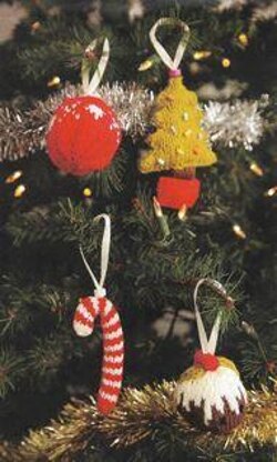 This is a pattern for four Christmas tree decorations, originally published in Knitting magazine. Candy cane, bauble, tree and Christmas pudding. these are simple to make using small amounts of dk yarn. You will also need toy stuffing. Photo Knitting magazine.