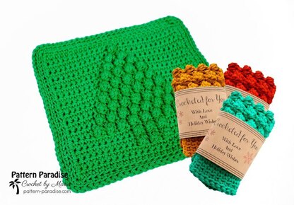 A holiday dish cloth to brighten up your kitchen. The Christmas tree motif in the center is worked in a simple bobble stitch that creates the design as well as providing a great scrubbing surface. Make these in lots of colors to have them at the ready. They also make adorable small gifts and if you like you can wrap them in using my free printable “Crocheted For You” sleeve!