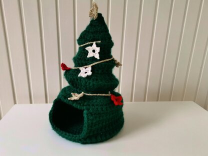 This pet Christmas tree house is made with Super Chunky / Super Bulky yarn. he accessories (stars and garland) are made with a DK yarn.