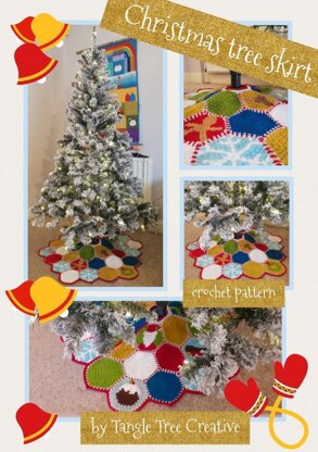 Made by piecing together unique hexagons with Christmas themed motifs, you can create a circular skirt with a handy split/seam which allows you to easily wrap the skirt around the base of your tree.