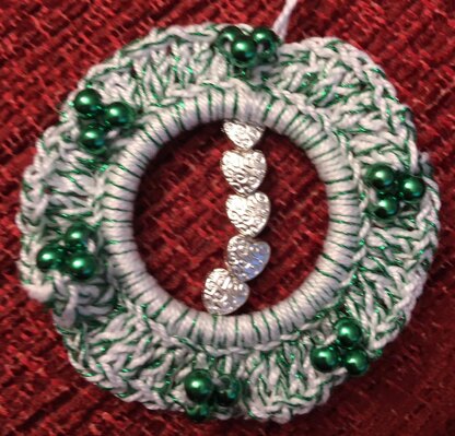 This is a pattern for a Christmas tree decoration: a wreath. The finished size is approximately 6cm across. It is worked into a 30mm solid ring. It is worked with crochet thread and a metallic sewing thread to add extra sparkle. (this does not show well I photos.)