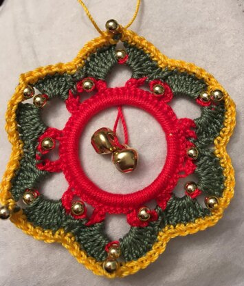This is a pattern for a Christmas tree decoration: a wreath. The finished size is approximately 7cm across. It is worked into a 30mm solid ring.