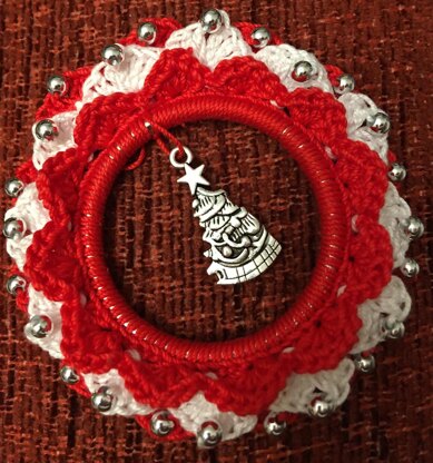This is a pattern for a Christmas tree decoration: a wreath. The finished size is approximately 7.5cm across. It is worked into a 50mm solid ring and also needs 24x4mm beads and a bell or decoration for the centre.