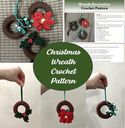 This wreath is easy to make and only requires knowledge of a few crochet stitches. It comes with options to make either a Holly, Poinsettia or Mistletoe decoration.