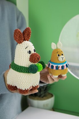 Yarn options: semi-cotton yarn or plush yarn Hook sizes: 2.3 mm (semi-cotton), 3.5 mm (plush) Safety eyes: 6 mm (semi-cotton), 12 mm (plush) Finished size: ~10 cm (semi-cotton), ~21 cm (plush)